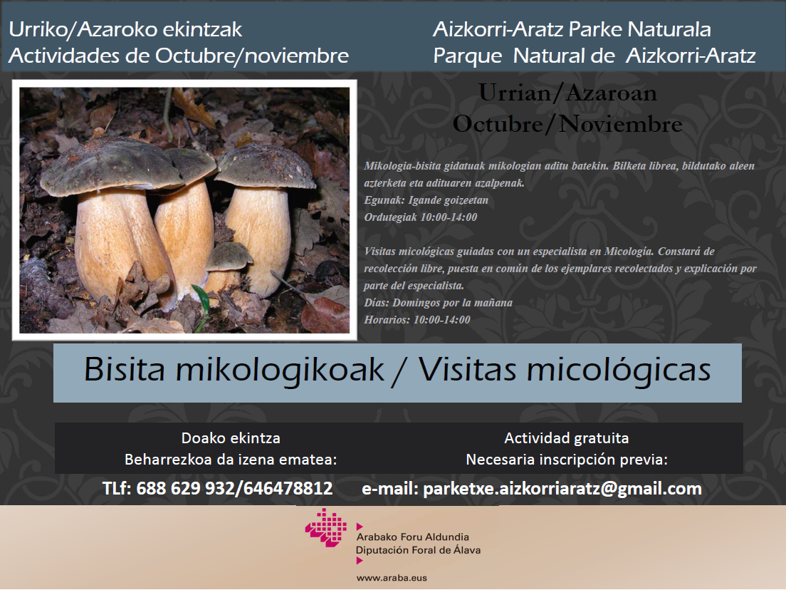 ¿Te gusta ir a por setas y hongos? El Parque Micológico de Asparrena organiza visitas micológicas guiadas por un/a especialista durante los domingos de los meses de Octubre y Noviembre en horario de 10 a 14 h. Esta visita guiada gratuita, además de dar derecho a la recolección libre durante un recorrido por el Parque Aizkorri-Aratz y la puesta en común de los ejemplares recolectados, consta de la explicación por parte del/ la especialista, un servicio de consultoría micológico. Este experto/a te asesorará sobre tus setas recogidas, tanto para conocer su nombre, como para saber si son comestibles o no, evitando así que te vayas a casa con un ejemplar tóxico.