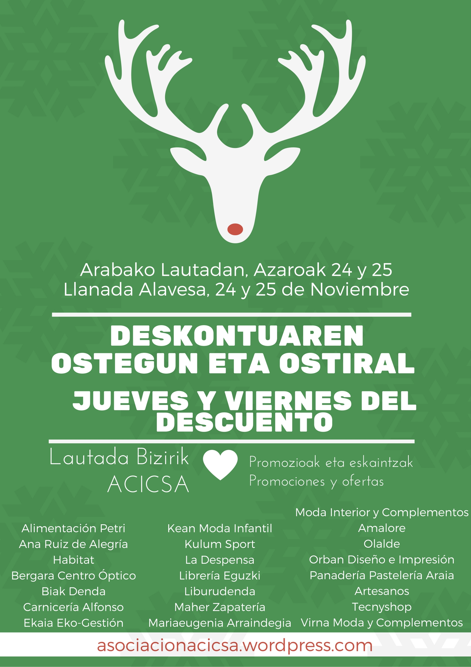 Este jueves 24 y viernes 25 de Noviembre, 19 comercios de Agurain y Araia disfrutan de descuentos, ofertas y promociones en alimentación, decoración, óptica, moda, compostaje, librería, calzado, telefonía móvil, diseño e impresión.