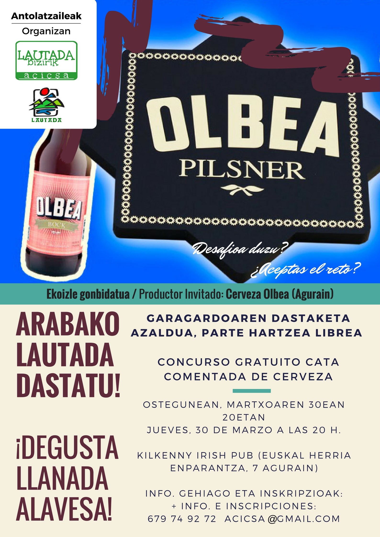 El concurso será el jueves, 30 de marzo a las 20 h. en Kilkenny Irish Pub (Plaza Euskalherria, 7 Agurain) y el reto consistirá en superar preguntas, interrogantes y dificultades para adivinar el producto local, cerveza Olbea Pilsner de Alaiza Brewing, propuesto en esta quedada, en la que se comparará con otras cervezas.