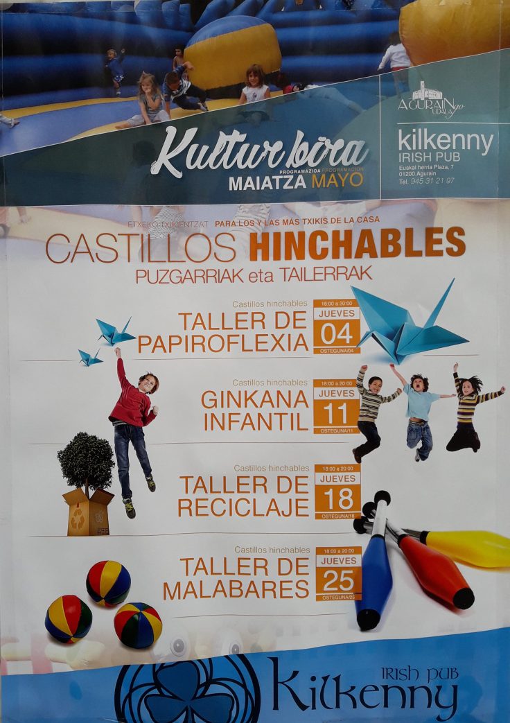 El programa de castillos hinchables y talleres de Kilkenny Irish Pub ( Euskal Herria Enparantza, 7 Agurain) continúa hoy, jueves de 18 a 20 h., con la idea de entretener a los/as más txikis. Ginkana infantil, reciclaje o malabares constituyen una oferta variada para todos los gustos y todas las edades.