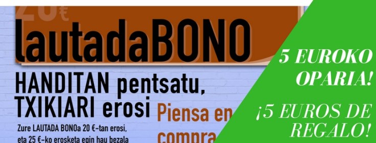 Adquiere tu Lautada Bono en Asador Baralde (Alegría-Dulantzi), Las Ventas Bar-Restaurante (Egino) o en Inmobiliaria Agurain y Orekan Fisioterapia (Agurain) por un importe de 20 euros y tendrás 25 euros para comprar en los más de 50 establecimientos participantes, ¡5 euros de regalo!