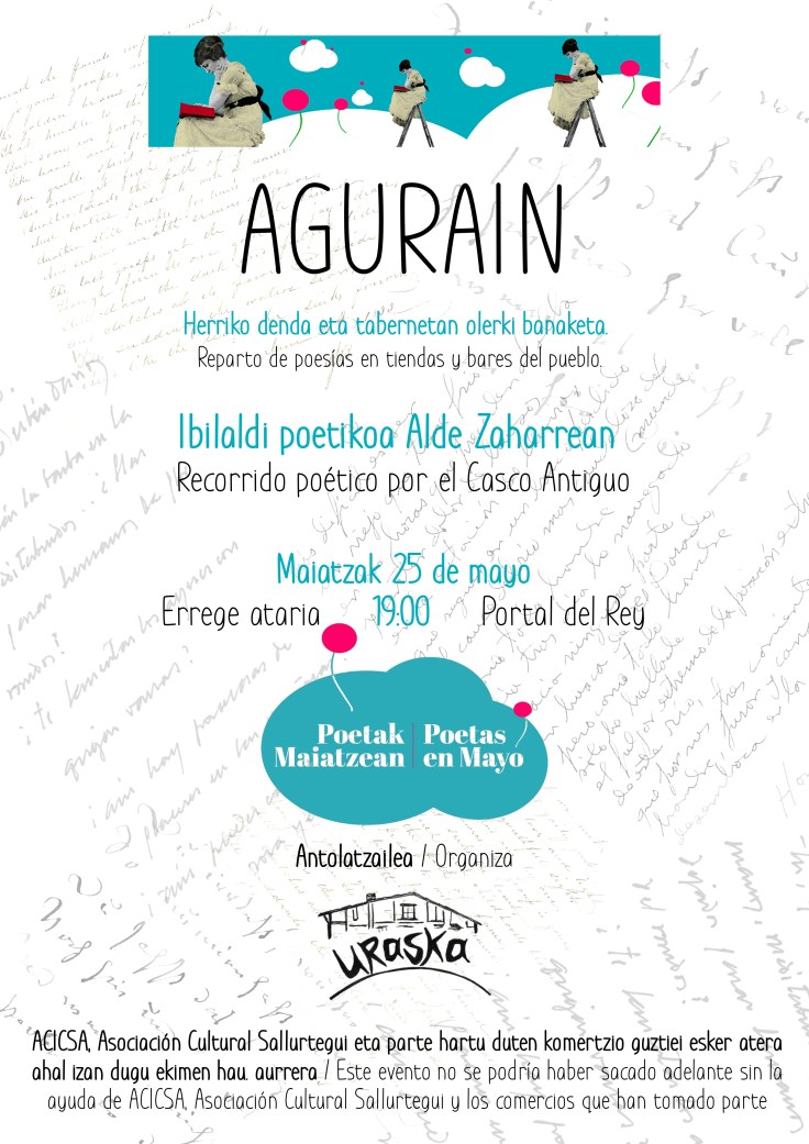Este viernes, 25 de mayo, a las 19 h. se ha programado un recorrido poético por el Casco Histórico de Agurain que dará comienzo en Portal del Rey. Participa en estos versos libres que atraparán tu emoción.