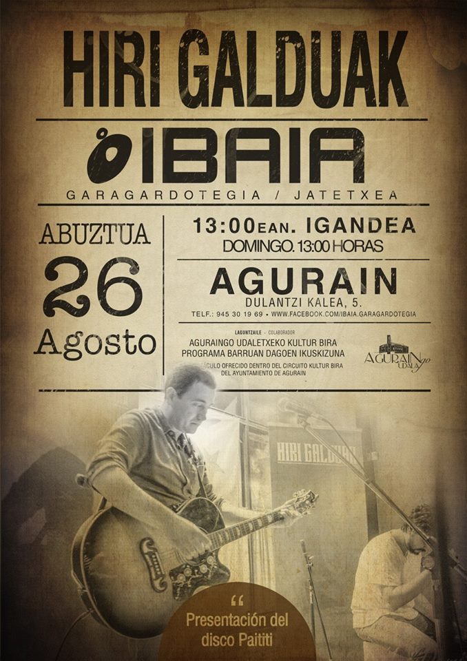Este domingo 26 de agosto a partir de las 13 h. concierto del grupo Hiri Galduak, el nuevo proyecto en acústico del músico y alma máter Josu Bravo, presentando el disco debut «Paititi» en Ibaia Garagardotegia (C/ Dulantzi, 5 Agurain). Y además, ¡gratuito!