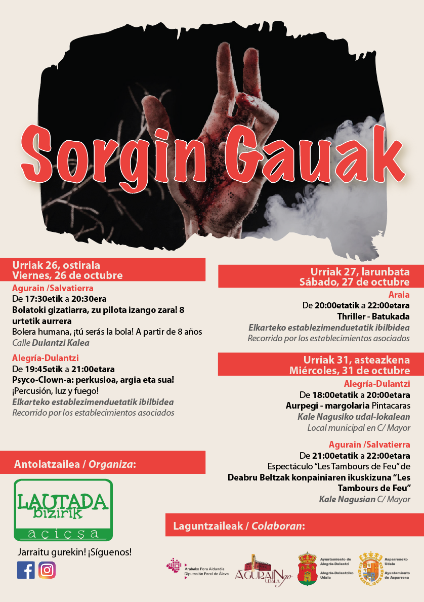 AVISO IMPORTANTE: Debido a la previsión de lluvia para mañana, 31 de octubre, en Agurain nos vemos obligados a aplazar la actuación de «Deabru Beltzak». La nueva fecha propuesta será el viernes 23 de noviembre en horario de 21 a 22 h. por la calle Mayor de Agurain. El resto de actividades previstas para mañana se mantienen: