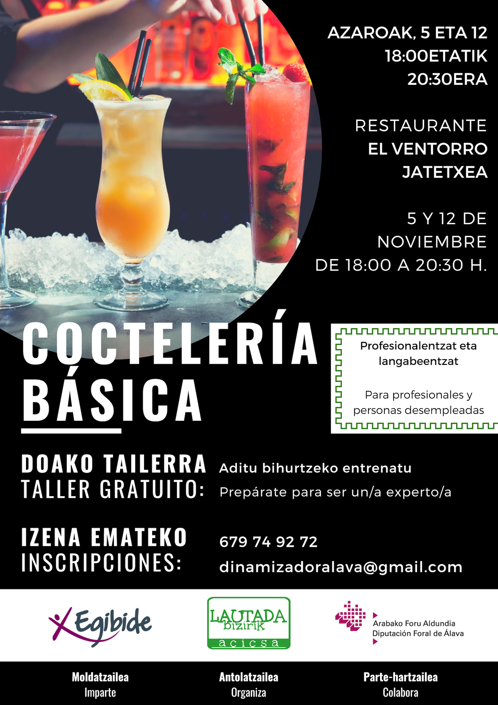 A través de este curso práctico organizado por la asociación Lautada Bizirik ACICSA aprenderás todos los elementos y herramientas necesarias para llevar a cabo un servicio de coctelería, con profesionalidad y calidad. Está especialmente dirigido a camareros/as y responsables de hostelería o personas desempleadas que quieran iniciarse en el mundo de la coctelería.