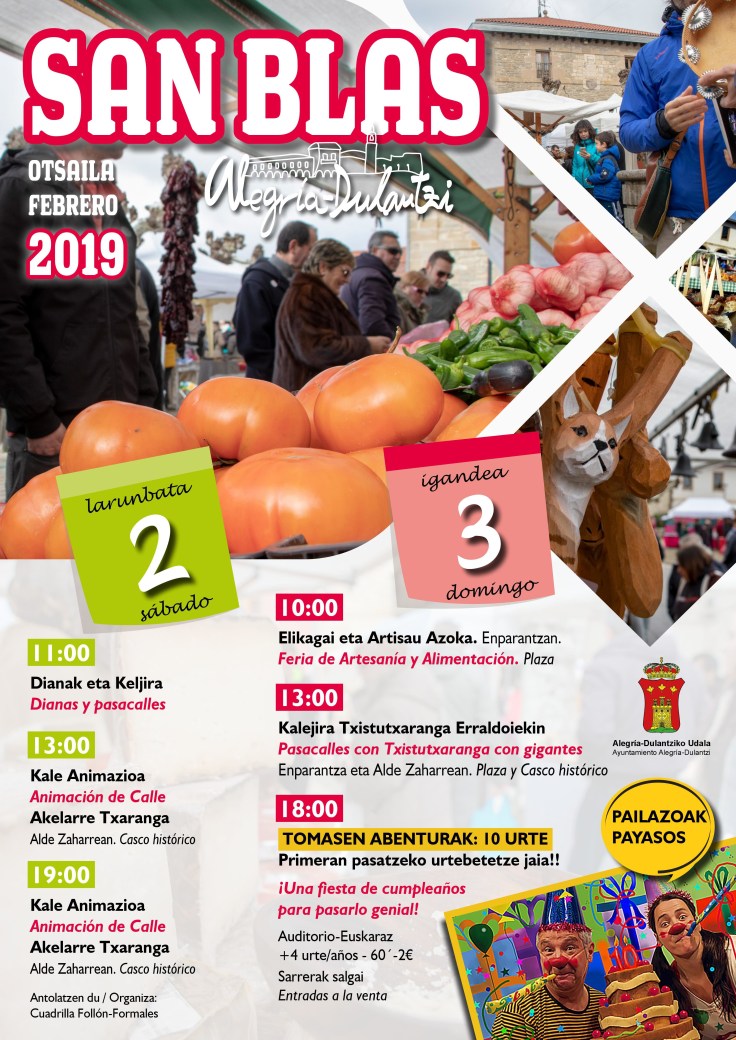 Alegria-Dulantzi celebra los próximos 2 y 3 de febrero su tradicional Feria de San Blas, su patrón. Artesanos y artesanas de diferentes categorías ofrecerán sus productos de artesanía y alimentación, en un ambiente festivo y con actividades de animación.