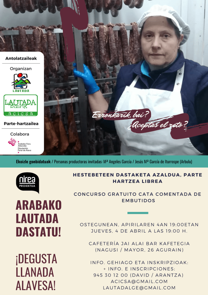 Este evento comarcal, nació de la voluntad de promocionar tanto a las personas productoras de Llanada Alavesa como a los productos que aquí se cultivan y los locales de hostelería de la comarca. Tras el tomate, en esta ocasión el turno es para los embutidos locales de Mª Ángeles García y Jesús Mª García de Iturrospe de Arbulu.