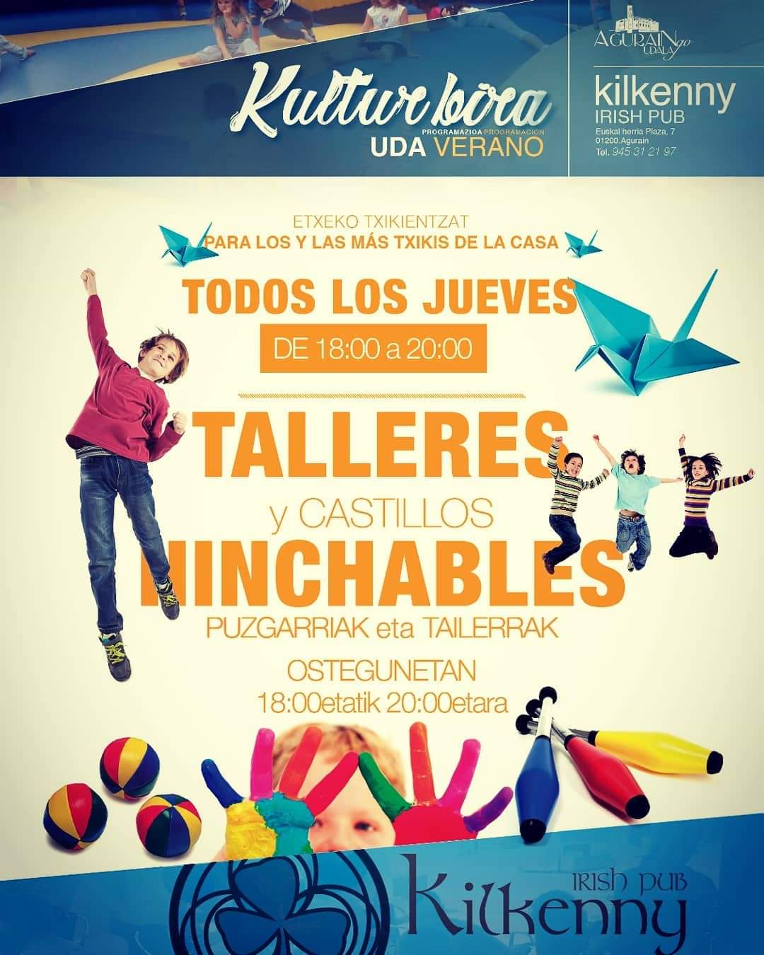 Todos los jueves de 18 a 20 h. un sinfín de actividades para los y las más txikis de la casa en Kilkenny Irish Pub (Plaza Euskalherria, 7 Agurain), ¡tu terraza de verano en el barrio del Harresi! Disfruta del sol con castillos hinchables y talleres infantiles.