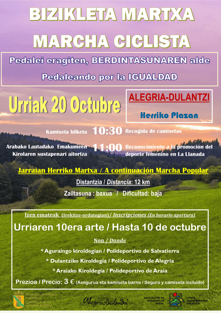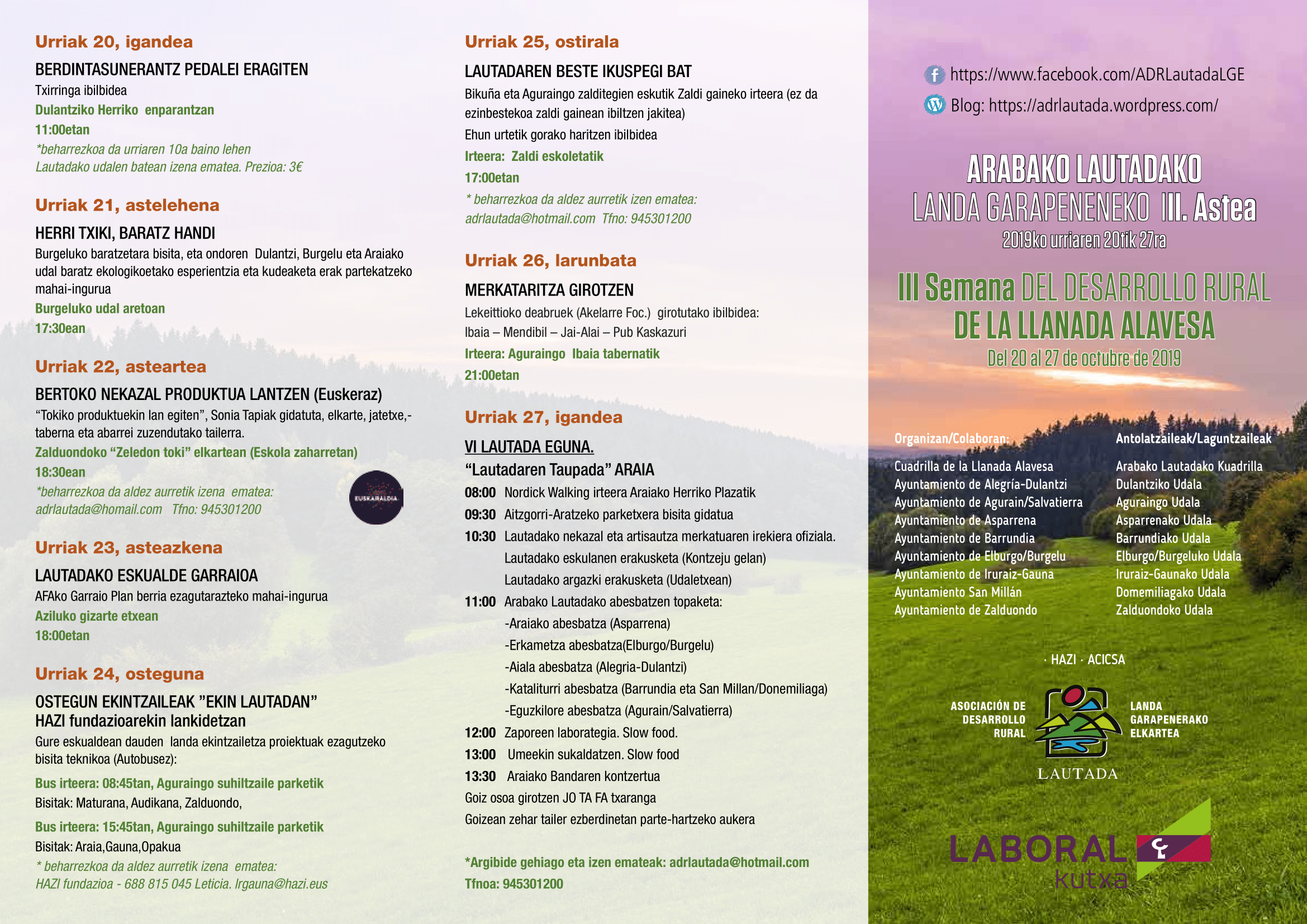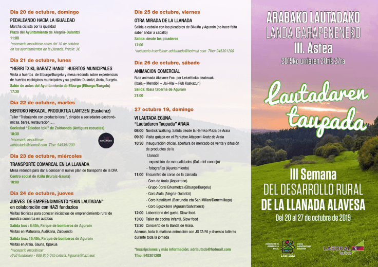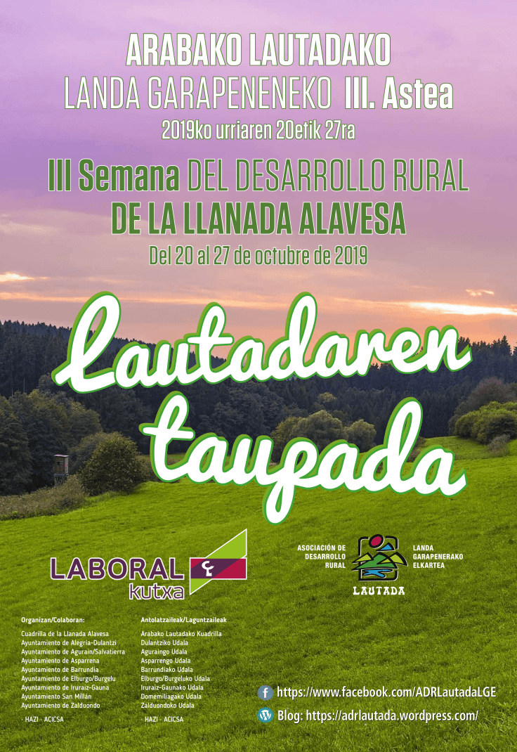 La asociación de desarrollo rural (ADR Lautada) pondrá en marcha desde el 20 al 27 de octubre la tercera semana del Desarrollo Rural – Lautadaren Taupada que a través de diferentes charlas y actividades busca dar a conocer las posibilidades de esta comarca alavesa. La asociación dinamiza diferentes iniciativas lúdicas y técnicas en las diferentes municipios que conforman Llanada Alavesa.