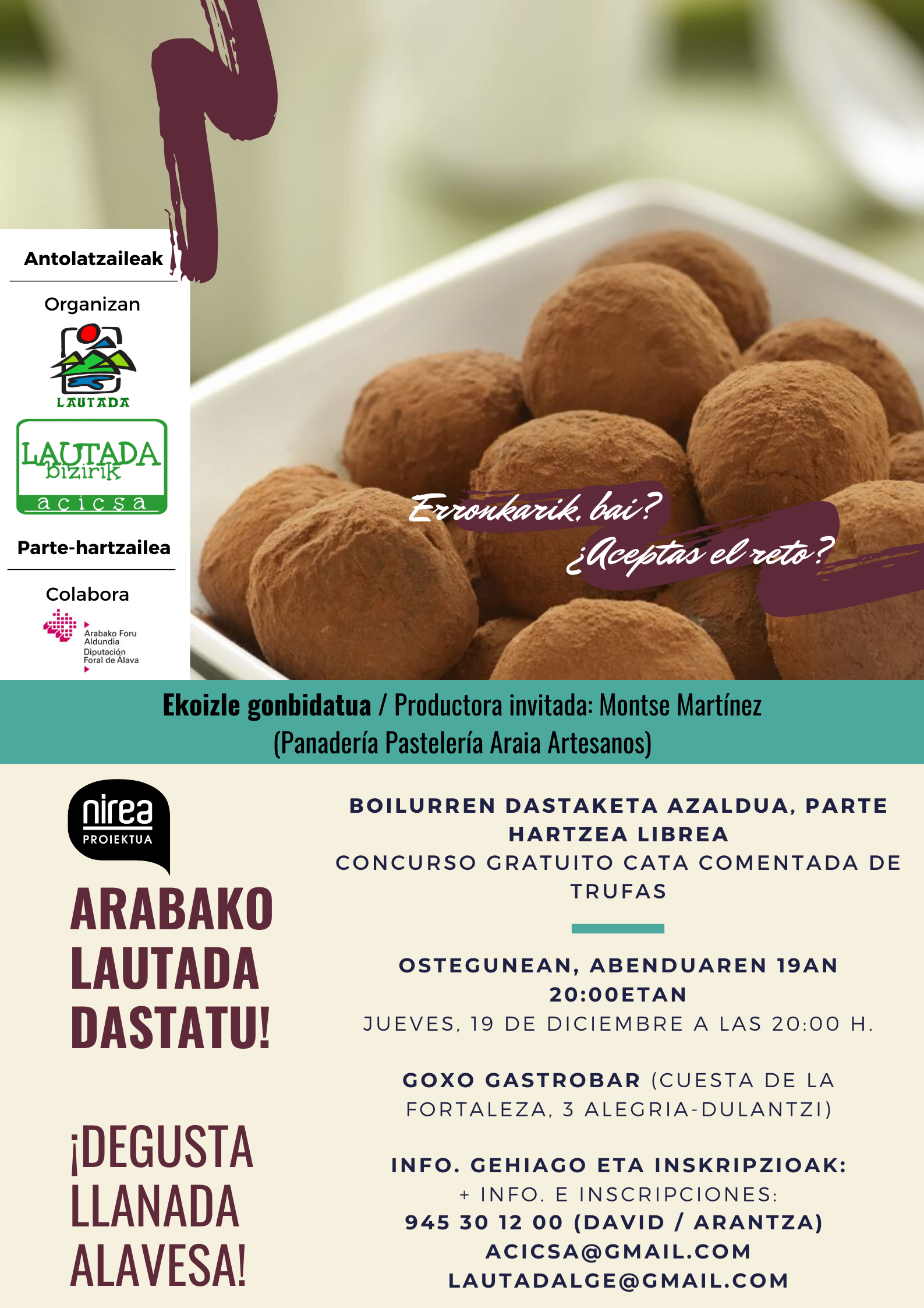 Tras el pollo, en esta ocasión el turno es para las trufas locales de Panadería Pastelería Araia Artesanos (Herriko Enparantza, 5). Después la cata comentada se realizarán juegos para determinar quién es el Mejor Embajador o Embajadora de Llanada Alavesa.