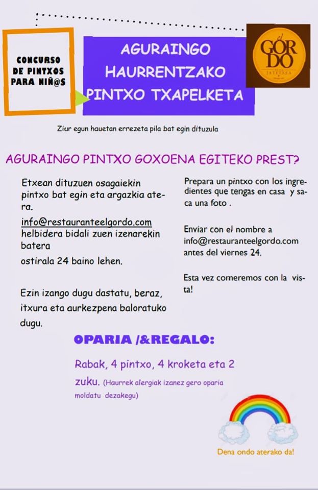 ¡Demuestra tus habilidades culinarias y gana el Concurso de Pintxos organizado por Restaurante El Gordo (C/ Mayor, 69 Agurain)! Tendrás que elaborar un pintxo con los ingredientes que tengas por casa. ¿Te atreves?