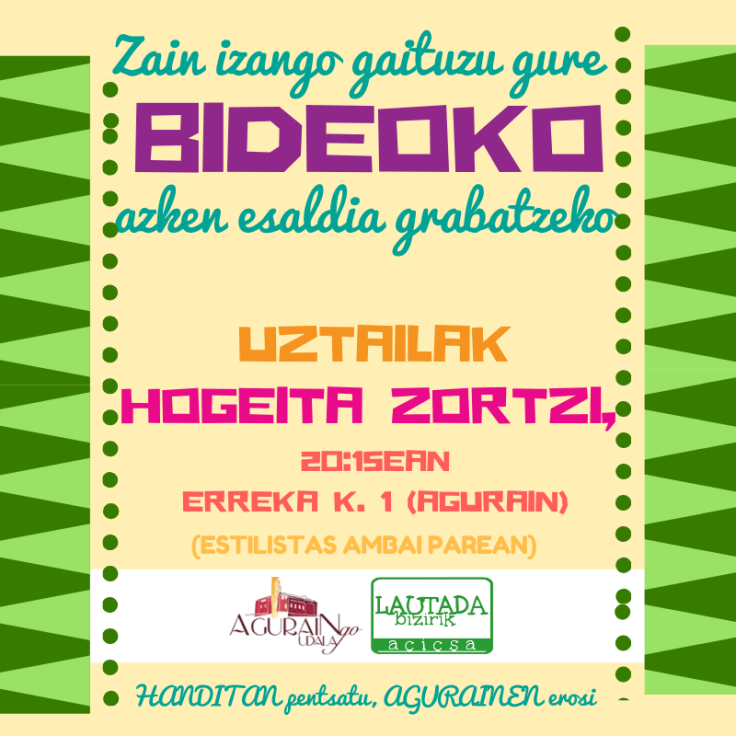 Debido a la escasa luz solar con la que contamos en el día de hoy vamos a cambiar la ubicación de la grabación de la escena de la última frase para la promoción del comercio local: «HANDITAN pentsatu, AGURAINEN erosi» (Piensa en GRANDE, compra en AGURAIN).
