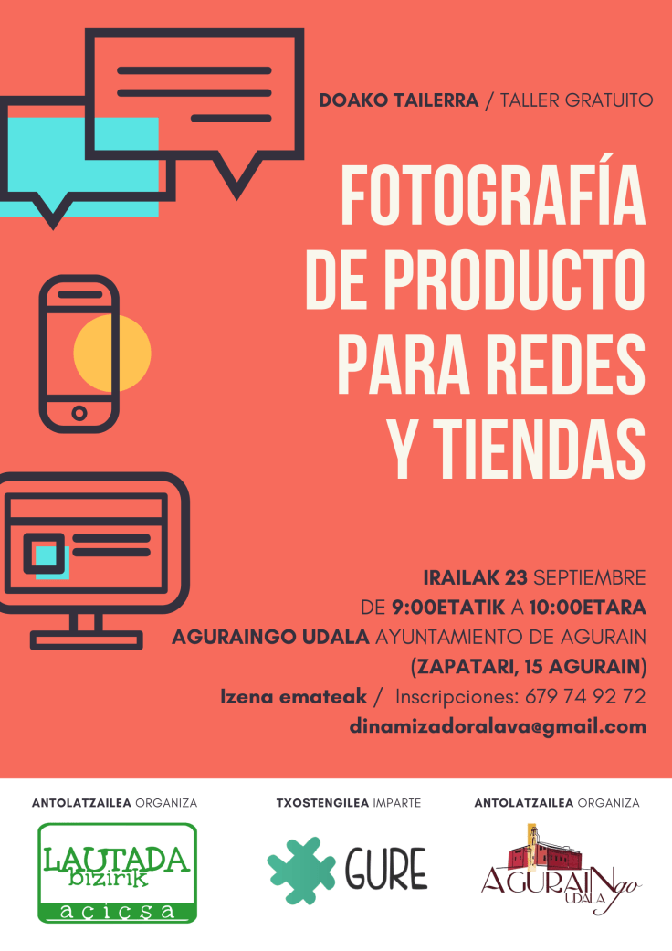 Hemos organizado un taller gratuito sobre fotografía de producto para redes y tiendas el próximo miércoles 23 de septiembre de 9:00 a 10:00 h. de la mañana en el Ayuntamiento de Agurain (C/ Zapatari, 15 Agurain, Sala Manu Yanke). El argumento de venta más efectivo que puedes utilizar, cuando tu público no tiene acceso al producto, es la fotografía.