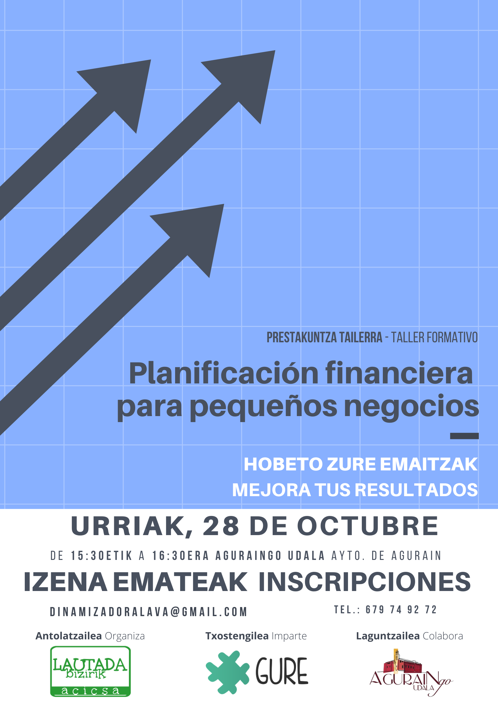 La asociación Lautada Bizirik ACICSA ha organizado un taller gratuito sobre planificación financiera el próximo miércoles 28 de octubre de 15:30 a 16:30 h. en el Ayuntamiento de Agurain (C/ Zapatari, 15 Agurain, Sala Manu Yanke). Las exigencias de un mercado cada vez más activo en la búsqueda de información te obliga a estar continuamente reinventándote y a permanecer constantemente en alerta a fin de mejorar tu proceso para, de este modo, lograr la mejora de tus resultados, que logrará tu supervivencia a medio y largo plazo.