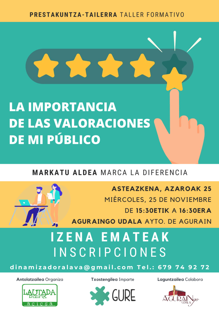 La asociación Lautada Bizirik ACICSA ha organizado un taller gratuito sobre la valoración de tu público el próximo miércoles 25 de noviembre de 15:30 a 16:30 h. en el Ayuntamiento de Agurain (C/ Zapatari, 15 Agurain, Sala Manu Yanke). La retroalimentación es importante en esta era, principalmente centrada en transmitir una buena experiencia de compra.