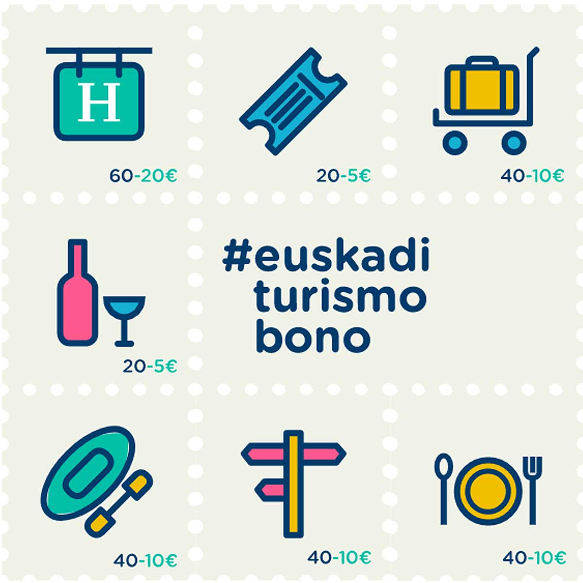 Euskadiko turismo-bonuarekin, gastronomiaz, ostalaritzaz, hotel-gauez, txangoez, bisita turistikoez eta askoz gauza gehiagoz gozatu ahal izango duzu. Erosketak egiteko 20, 40 eta 60 euroko deskontuak, Euskadin zehar galtzeko eta aukerarik ez galtzeko.