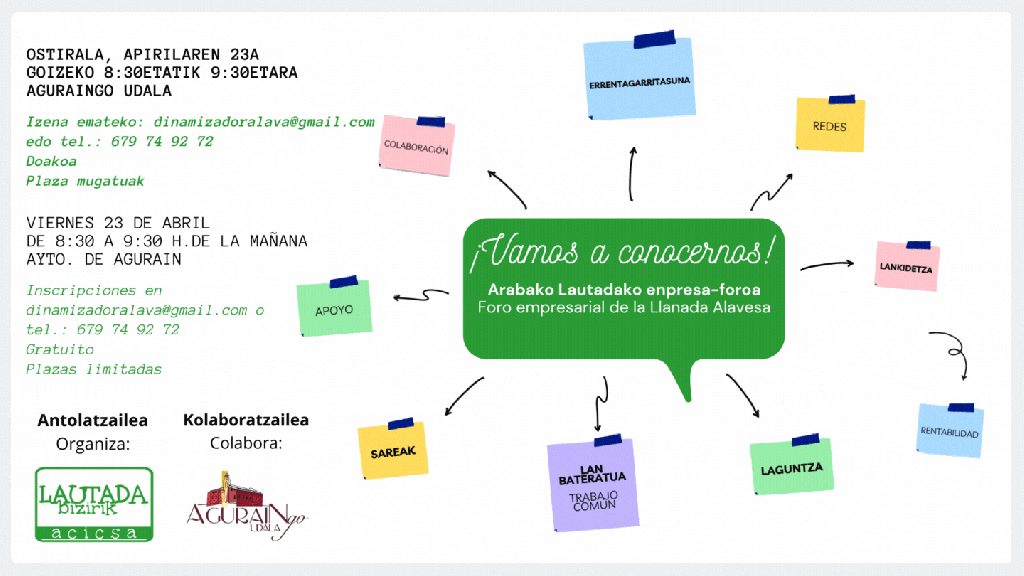 Apirilaren 23an, ostirala, enpresen arteko «¡Vamos a conocernos!» topaketa egingo da, Lautada Bizirik ACICSAk antolatuta, Aguraingo Udalaren laguntzarekin.