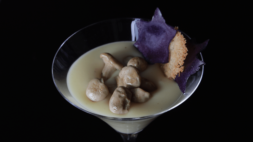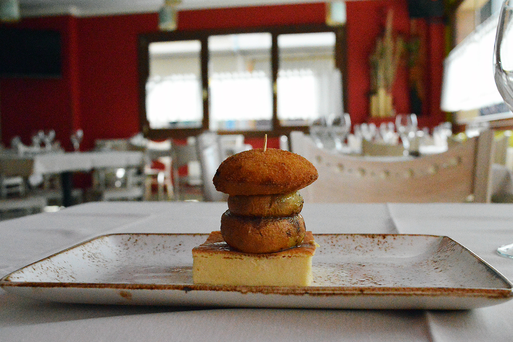 Osagaiak: oinarrirako, Herediako patataren parmentierra, boilur-olioa eta gurina. Gainean, Aguraingo mendietako perretxiko salteatu bat, Iturrietako patata eta Aixtrako gazta. Ingredientes: para la base, parmentier de patata de Heredia, aceite de trufa y mantequilla. Encima, un salteado de perretxikos de los montes de Agurain, una patata de Iturrieta y queso de Aixtra.