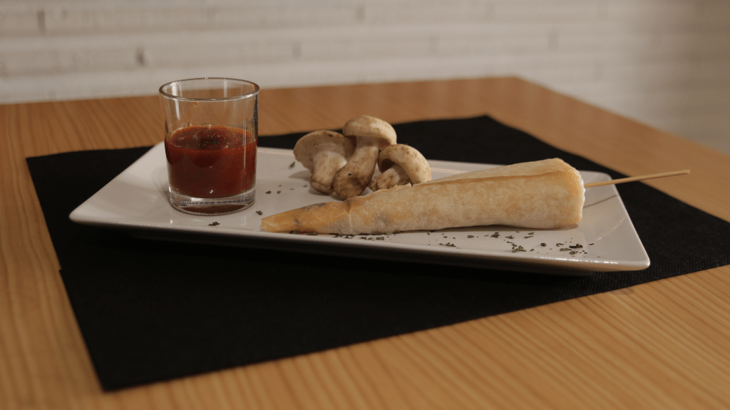 Osagaiak: brick masa, betxamela, barraskilo haragia, perretxikoa eta barraskilo saltsa Ingredientes: masa brick, bechamel, carne de caracol, perretxiko y salsa de caracol