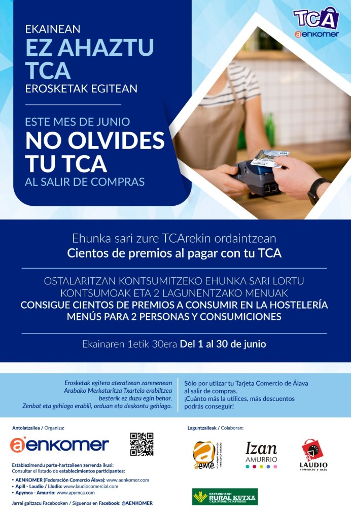 En colaboración con Caja Rural, tú puedes ser la persona beneficiaria. Comprando con la Tarjeta gratuita de Comercio de Álava (TCA) puedes ganar menús para 2 personas y consumiciones de 5 euros canjeables hasta el 12 de septiembre. Conocerás si tienes premio, porque en la boleta del justificante del datáfono lo indicará.