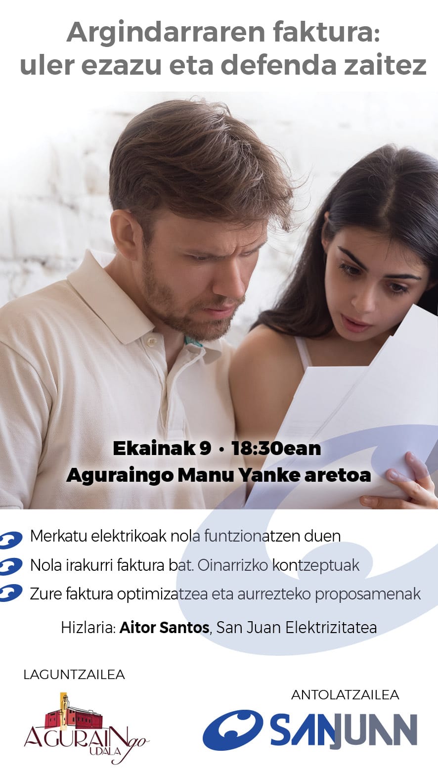 Parte hartu «Argindarraren faktura: uler ezazu eta defenda zaitez» jardunaldian, merkatu elektrikoak nola funtzionatzen duen ulertzeko behar duzun informazio guztia izan dezazun, zure beharretara ondoen egokitzen den tarifa aukeratzen jakiteko eta argiaren faktura azkar eta erraz ulertzeko.