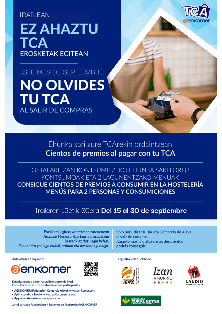 AENKOMER – Federación Alavesa de Comercio y Servicios apoya esta última quincena de septiembre al castigado sector de la hostelería premiándote en tus compras con la Tarjeta gratuita de Comercio de Álava (TCA).