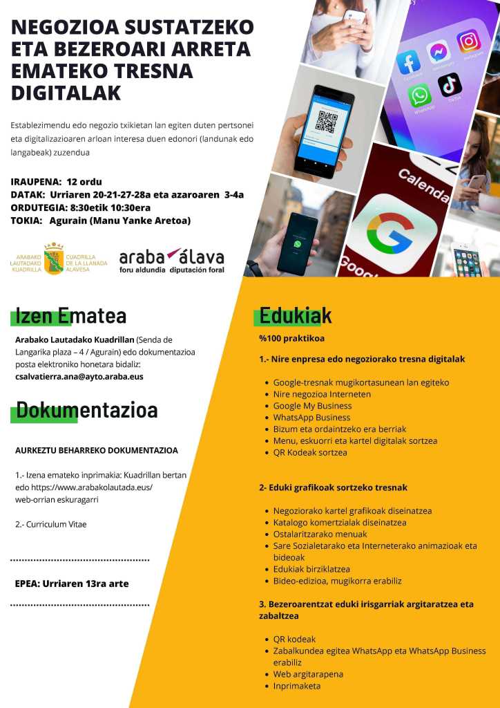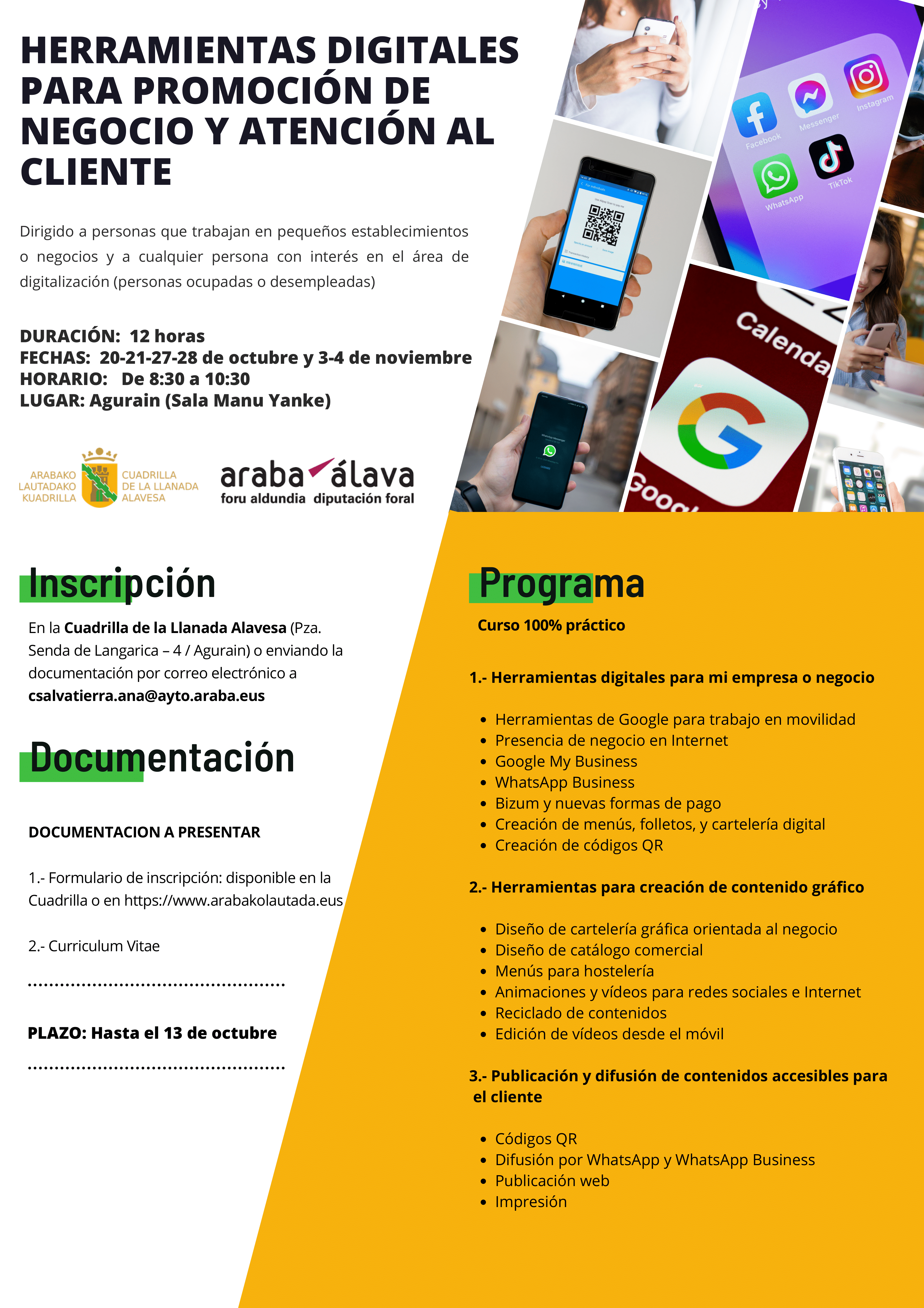 Zure marketin digitaleko estrategia garatzeko, Arabako Lautadako Kuadrillak «Zure negozioa sustatzeko eta jendeari arreta emateko tresna digitalak» erabiltzeko doako prestakuntza-ikastaro bat egingo du, Arabako Foru Aldundiaren bidez finantzatua.