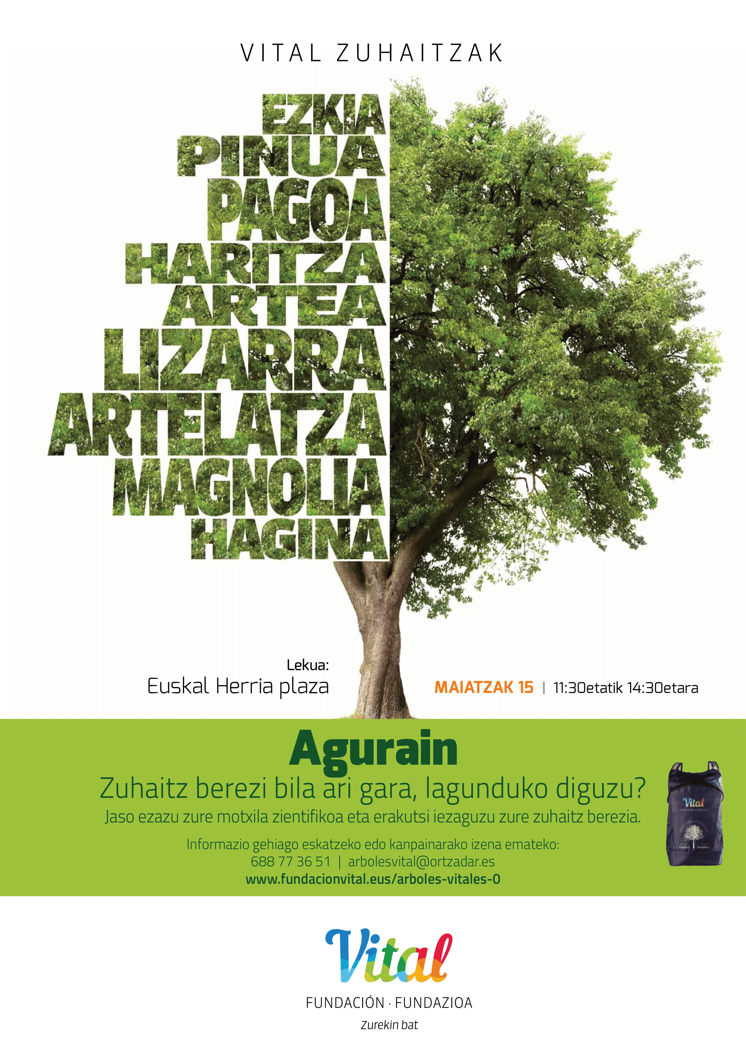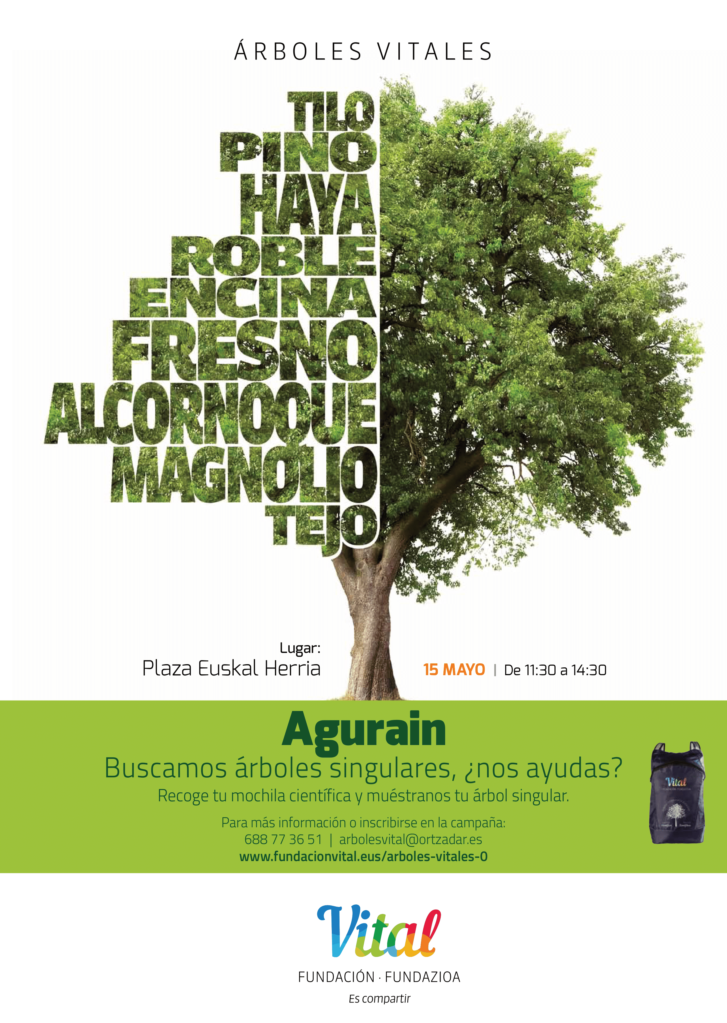 Igande honetan, maiatzaren 15ean, Vital Fundazioa Aguraingo Euskalherria Plazan izango da goizeko 11:30etatik aurreraAurten ere haien “Vital Zuhaitzak” programarekin itzuliko dira, banatuko diren motxila zientifikoak erabiliz zuhaitz edo baso bat aztertu eta babesean hartzeko.