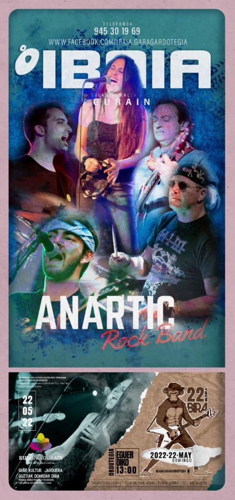 Ganas del concierto de Anartic Rock Band a la 13:00 h. de este domingo 22 de mayo en Ibaia Garagardotegia. Entrada libre. Se repasarán los grandes éxitos del rock desde los 70 hasta hoy.
