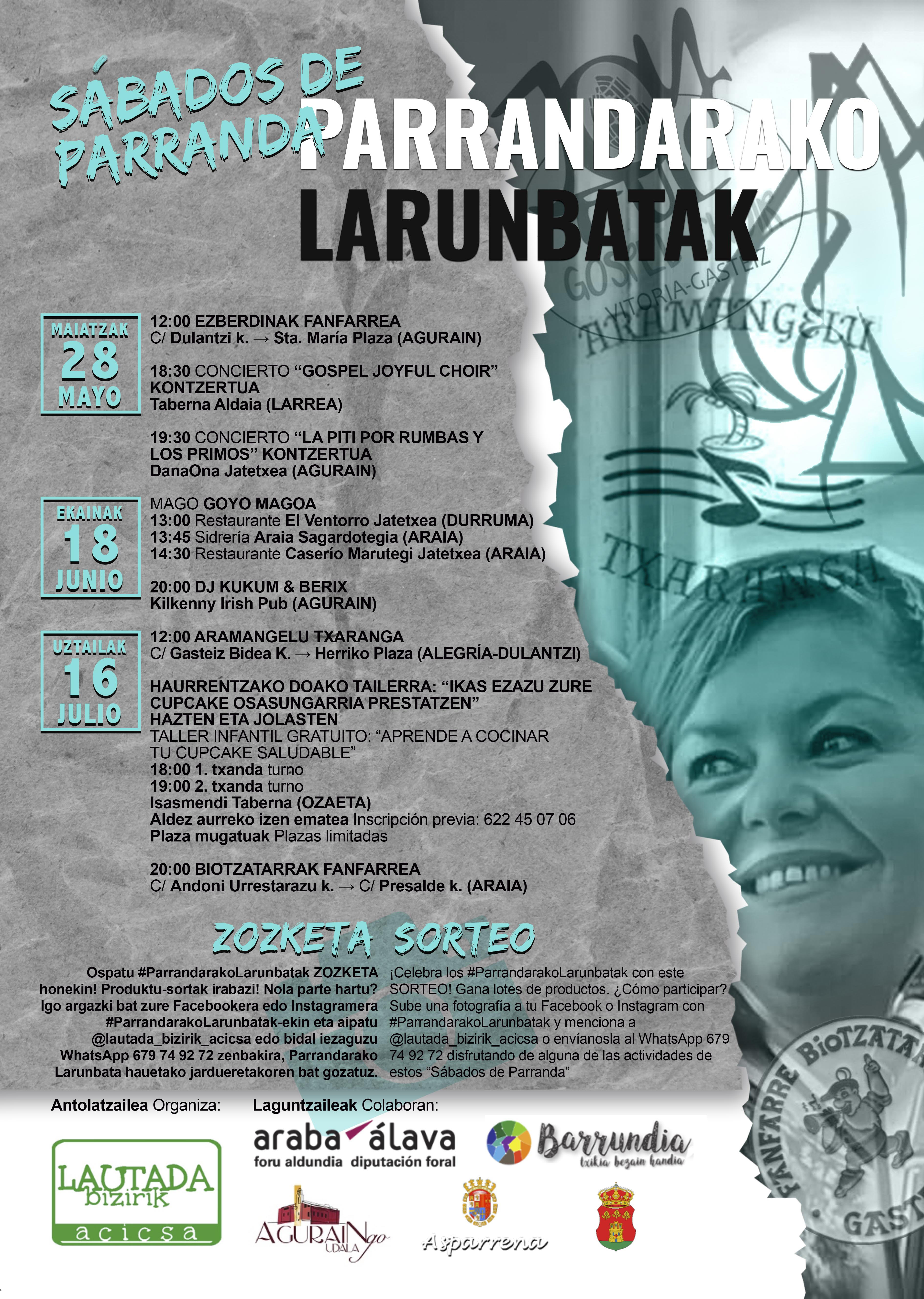 Los sábados 28 de mayo, 16 de junio y 18 de julio tendrá lugar la primera edición de nuestros «Sábados de Parranda» con los que pretendemos fomentar, apoyar y promover nuestro comercio, hostelería y servicios de la comarca de la Llanada Alavesa, nuestros principales motores económicos. Este año tendrán cabida los DJs, las txarangas, los talleres infantiles de cocina, los conciertos, la magia y los sorteos.