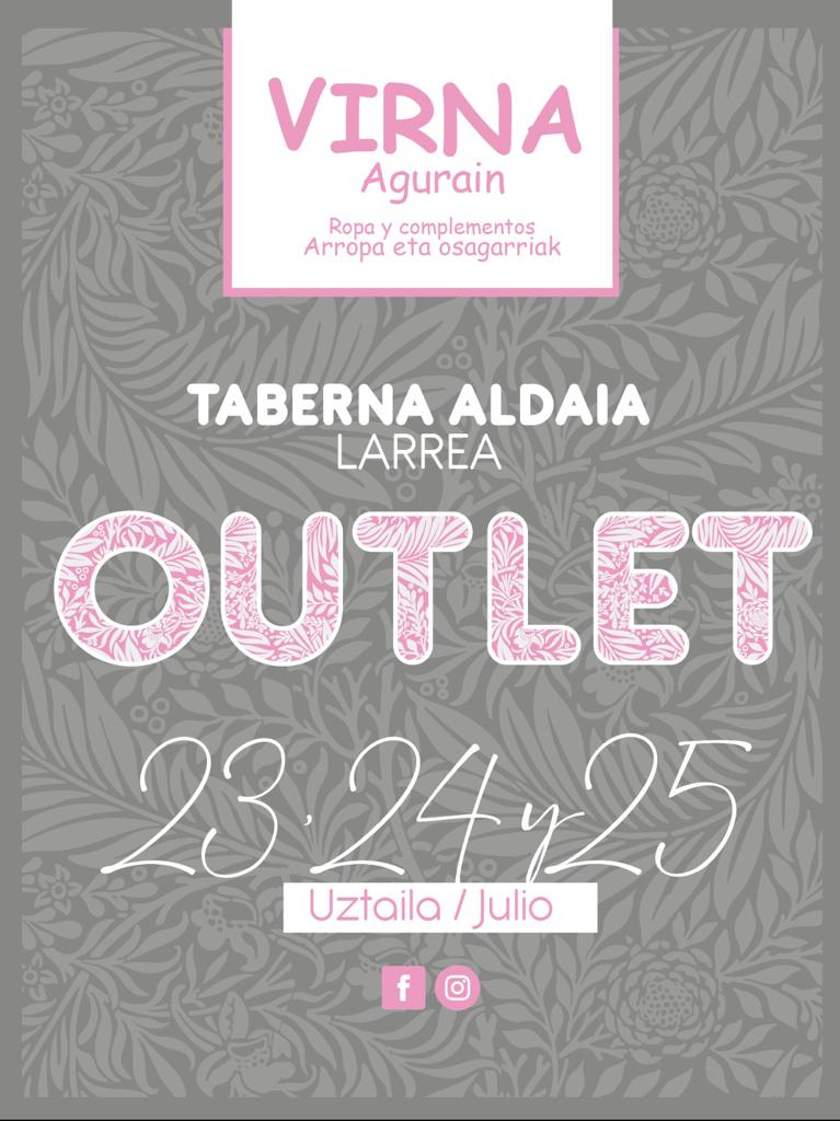 El Puente de Santiago ya está aquí y tenemos la propuesta que necesitas. Los días 23, 24 y 25 de julio outlet de Virna Moda y Complementos en la terraza de la Taberna Aldaia (C/ Ermitaurre, Larrea).