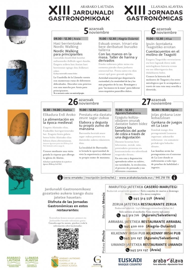 Badator aurten ere gure eskualdearekin dugun hitzordua. Azaro honetan, Arabako Lautadak zapore berezia du zure zain, gure jangelarena, hain zuzen ere. Patatak, ehiza, gazta, ogia eta onddoak dira XIII. Gastronomia Jardunaldi hauetako protagonistak. Kalitate goreneko produktuak, osasungarriak eta bikainak, gure tokiko ekoizleen lan ona bermatzen dutenak.