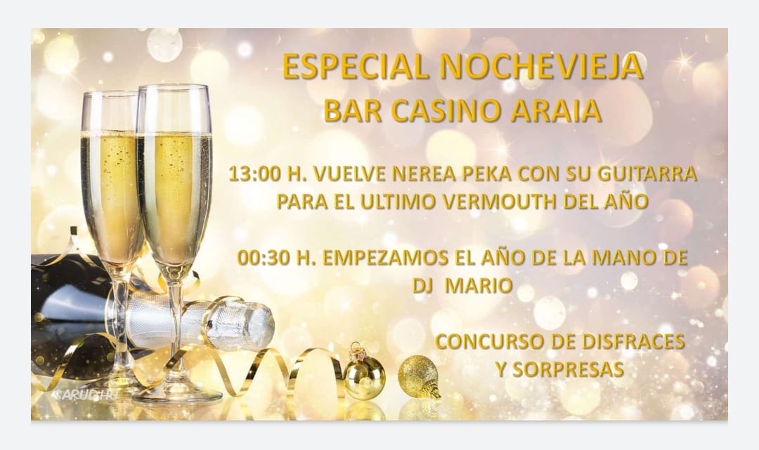 El Casino Taberna (C/ Presalde, 2 Araia) ha preparado un programa para hacer de tu nochevieja🌙 un día memorable en compañía de quienes más quieres🥰. Este sábado 31 de diciembre a las 13:00 h. habrá vermouth🍸 con Nerea Peka. A partir de las 00:30 h. celebra🥳 el comienzo del 2023 con Dj🎧 Mario.
