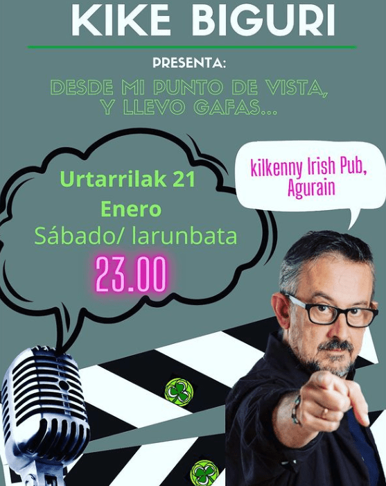 Este sábado 21 de enero a las 23:00 h. tienes una cita en Kilkenny Irish Pub (Plaza Euskal Herria, 7 Agurain) con el humorista Kike Biguri. No te pierdas la oportunidad de disfrutar del encanto, humor y sarcasmo de este actor, director y cómico.