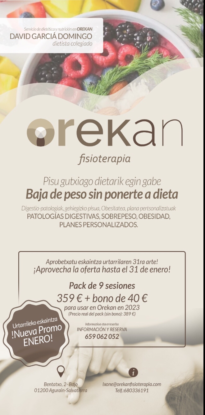 Orekan Fisioterapiaren (Bentatxo kalea, Agurain) helburu nagusia jaten irakastea da, zure helburuak lortu ondoren bizimodu osasungarria izan dezazun. Egiten dituzten plan pertsonalizatuak zure arabera egokitzen dira, adina, pisua, altuera, sexua, bolumenak eta bizi-ohiturak oinarri hartuta.