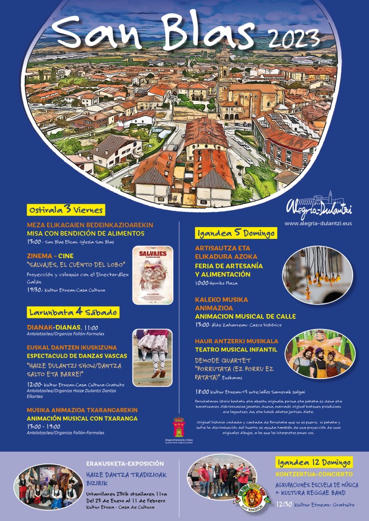 El domingo Alegría-Dulantzi celebra la fiesta de su patrón, San Blas, con una feria de artesanía y alimentación que abrirá las puertas a las 10:00 h. de la mañana. Desde la 13:00 h. habrá animación de calle.