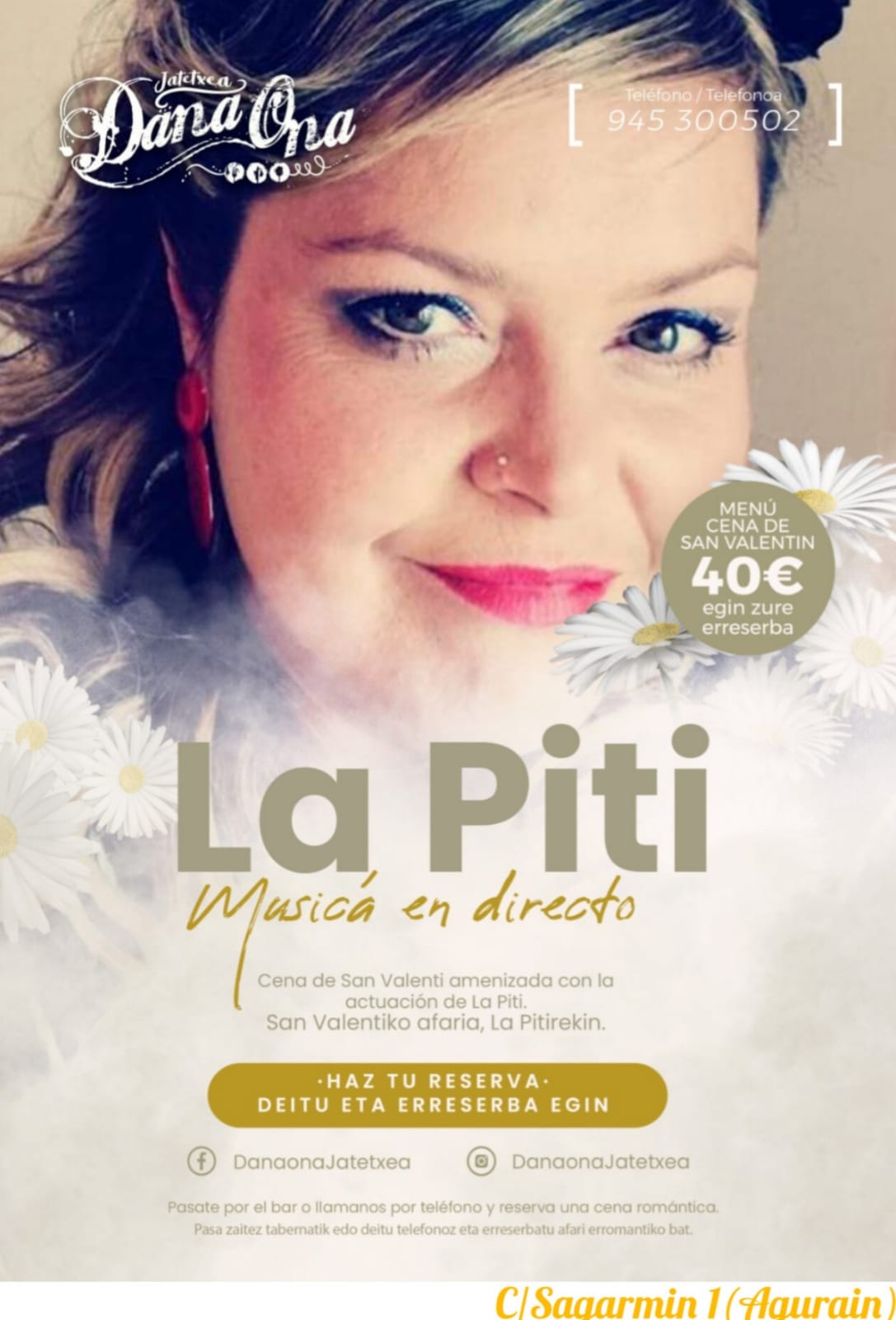 DanaOna Jatetxea (C/ Sagarmín, 1 Agurain) te ofrece disfruta de una romántica cena acompañada por el concierto de La Piti por rumbas. ¡Celebra la noche de San Valentín de la manera más romántica!