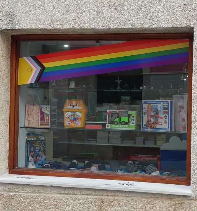 Apoyamos y visibilizamos los derechos de la comunidad LGTBIQ+ a través de la decoración de nuestros escaparates destacando los colores y símbolos emblemáticos del orgullo. Queremos transmitir un mensaje de inclusión y respeto hacia todas las personas, independientemente de su orientación sexual o identidad de género.
