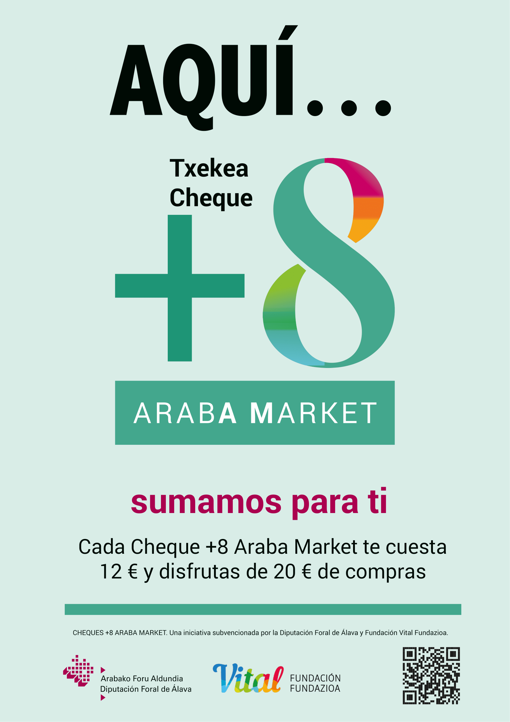 Tras el éxito del programa de Cheques +8 Araba Market de años anteriores, Diputación Foral de Álava vuelve a impulsar los cheques descuento. Benefíciate de 8 euros de descuento: paga 12 euros y disfruta de 20 euros.
