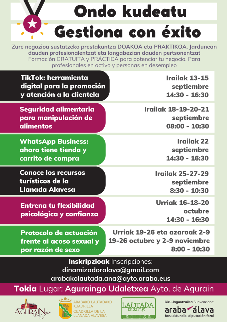 Ez galdu aukera zure enpresa-trebetasunak indartzeko edo zure tokiko negozioa hurrengo mailara eramateko. 🏢Aguraingo Udaletxean Arabako Lautadako Kuadrillarekin batera antolatu ditugun prestakuntza-tailerretan izango zaitugu zain!