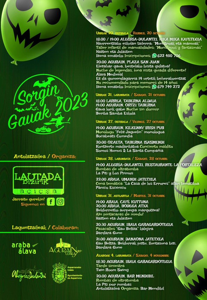 Este año, Sorgin Gauak promete una experiencia aún más emocionante con una amplia gama de actividades, desde talleres infantiles hasta conciertos malditos, pasacalles tenebrosos y mucho más. No es apto para corazones débiles. ¡Prepárate para vivir el terror en la Llanada Alavesa!