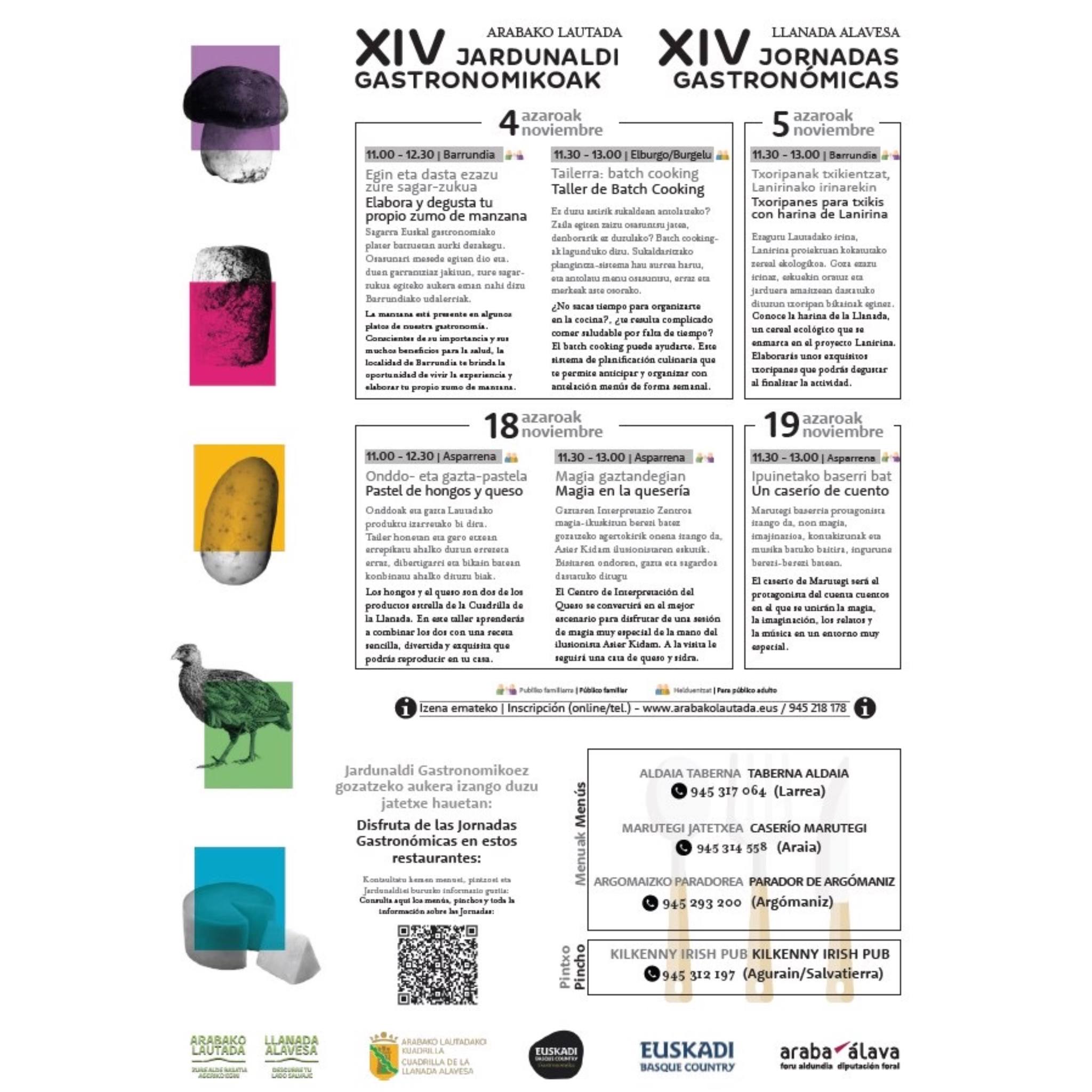Horiek guztiak dira Arabako Lautadan zain izango dituzun XIV. Jardunaldi Gastronomiko hauetako protagonistak. Bertan, gure sektore profesionalaren eta bertako sutegien lan onaz gozatuko duzu eta, gainera, gure eskualdea ezagutuko duzu gure eskualdeko baliabide turistikoek eskaintzen dituzten jarduera kultural, natural eta gastronomikoen bidez. Jardunaldi gastronomiko hauek azaroaren 4, 5, 18 eta 19an banatuko diren jarduerak dituzte.