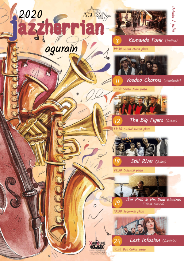 Jazzherrian taldeak 6 kontzertu proposatzen dizkizu uztailean. Aguraingo hainbat gunetan izango dira emanaldiak, uztailaren 3an hasiko da Komando Funkekin. Jazzherrian te propone 6 conciertos durante este mes de julio. Diferentes puntos de Agurain acogerán estas actuaciones que arrancarán el viernes 3 de julio con Komando Funk. Kovid-19aren agerpenak sortutako egoera gorabehera, JazzHerrian jaialdiak ez du... Leer más →