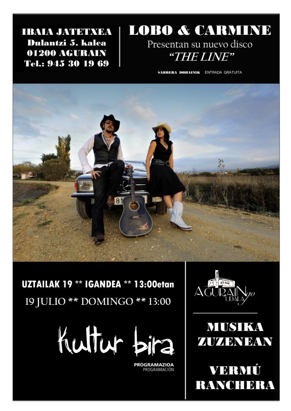 El dúo acústico con ritmo de country Lobo & Carmine actuará en Ibaia Jatetxea (C/ Dulantzi, 5 Agurain) para animar tu vermú este domingo a partir de las 13 h. La entrada es gratuita. Lobo & Carmine regresan al escenario del Ibaia con su country-mex sin prejuicios para presentar su nuevo disco The Line. http://www.youtube.com/watch?v=X_RNphCZYBw Si esto... Leer más →