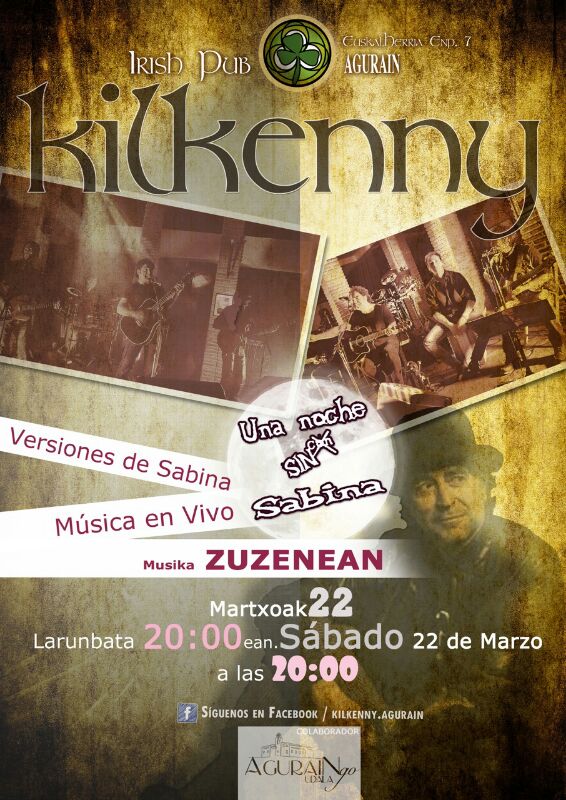 El Kilkenny Irish Pub volverá a acoger el próximo sábado 22 de Marzo a partir de las 23 h. el concierto del grupo Una Noche Sin Sabina. Se trata de una agrupación musical formada hace siete años que rinden tributo al gran maestro Joaquín Sabina. En dos horas, interpretarán sus grandes éxitos de variados estilos:... Leer más →