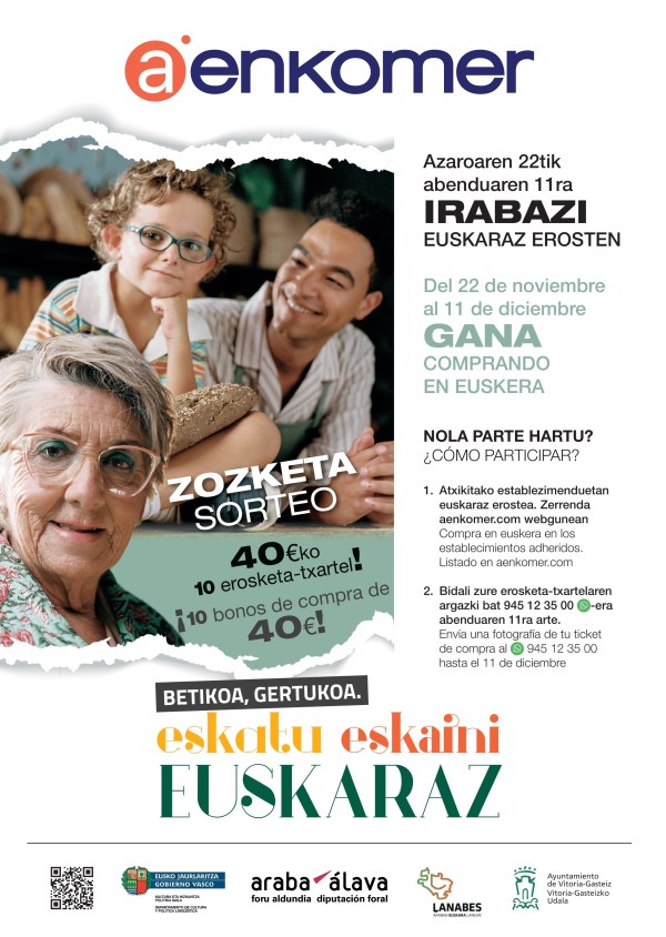 Abenduaren 3ra arte, AENKOMERek, Arabako Foru Aldundiarekin lankidetzan, 400 euro zozkatuko ditu saritan (zehazki, 40 euroko 10 erosketa-txartel), dendetan, tabernetan, jatetxeetan eta ekimenari atxikitako beste zerbitzu batzuetan euskara erabiltzen baduzu. Nola parte hartu "Irabazi euskaraz erosten" ekintzan? Egin ezazu erosketa euskaraz establezimendu horietako batean: Julen Karasatorre Harategia (Agurain) DanaOna Jatetxea (Agurain) Gestoria (Agurain) La Despensa... Leer más →