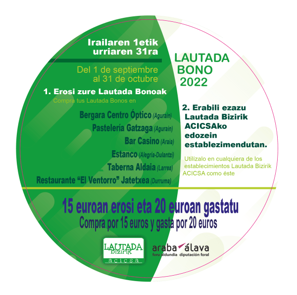 Erosi zure BONO LAUTADA hemen: Bergara Optika Zentroa (San Martin k., 6 Agurain)Gatzaga Gozotegia (Erregearen Atea k., 4 Agurain)Casino Taberna (Presalde k. 2, 1. Araia)Estankoa (K. Nagusia 23, Alegría-Dulantzi)Aldaia Taberna (Ermitaurre k., 7 Larrea)El Ventorro Jatetxea (Medialegua k., 1 Durruma) 15 euroren truke eta parte hartzen duten 70 establezimenduetan erosteko 20 euro izango dituzu, 5... Leer más →