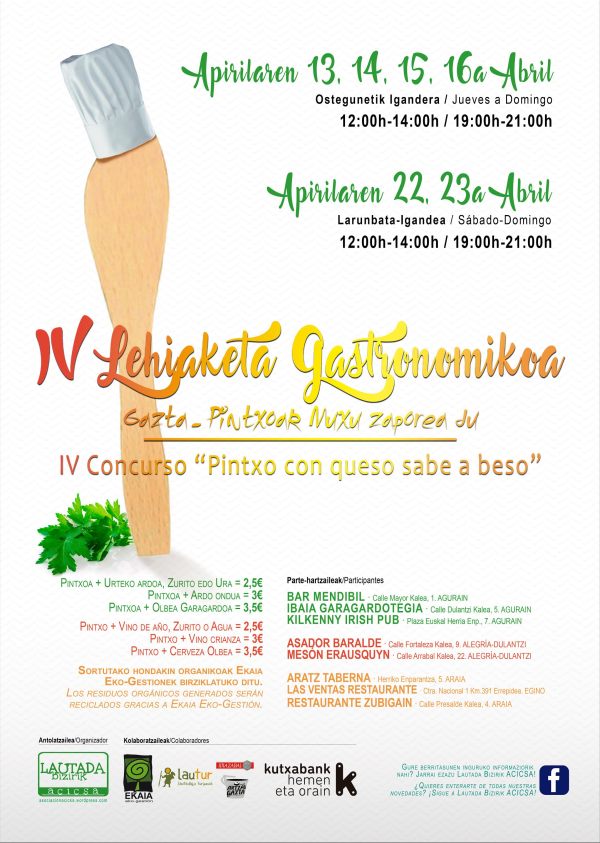 Nos subimos al carro gastronómico, con el protagonismo del queso Idiazabal de pastor durante el transcurso de 6 jornadas de degustaciones de las que saldrá el establecimiento participante ganador. La Feria de Artesanía completará las actividades previstas en Llanada Alavesa para esta Semana Santa. Tratamos de convertir la gastronomía en uno de nuestros filones para... Leer más →
