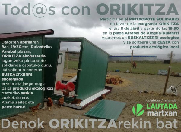 Larunbat honetan, apirilaren 8an, Dulantziko Arrabal plazan, Orikitza ekobaserria laguntzeko pintxopote solidarioa ospatuko dugu. Jai solidario honetan euskaltxerri ekologikoa erreko eta jango dugu baita produktu ekologikoz osaturiko saskia zozketatu ere. Anima zaitez eta parte hartu! Participa en el pintxo-pote solidario en favor de la ecogranja Orikitza el sábado, 8 de abril a partir de las... Leer más →