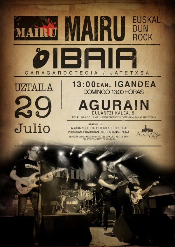 Por el escenario de Ibaia Garagardotegia (C/ Dulantzi, 5 #Agurain) pasará este domingo 29 de julio a partir de las 13 h. Mairu con su rock euskaldun. Este grupo compacto enmarcado dentro de la mejor tradición del pop-rock euskaldun, apuesta por la sutileza y los sonidos envolventes con un proyecto maduro, con canciones muy trabajadas ... Leer más →